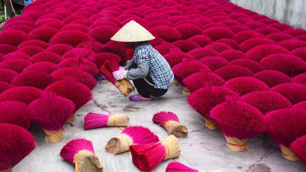 "Des bâtons d’encens de toutes les couleurs qui sèchent à l’air libre… Ce spectacle majestueux et hypnotique a lieu à Quang Phu Câu, au Vietnam, près de Hanoï. Il attire chaque année de nombreux touristes. Ce village est réputé pour être +le village de l’encens+. La vie de près de 3.000 familles tourne autour de cette activité artisanale", a décrit le reportage.