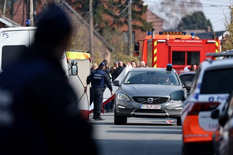 | Des policiers sur le site où une voiture a foncé dans une foule allant au carnaval, le 20 mars à Strepy-Bracquegnies, en Belgique. |