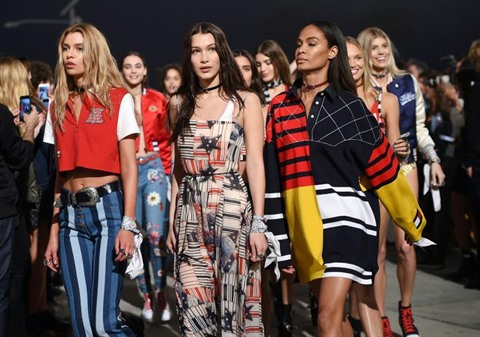 | Le mannequin Bella Hadid (1er plan, centre) lors de la présentation de la collection Tommyland de Tommy Hilfiger, le 8 février en Californie |