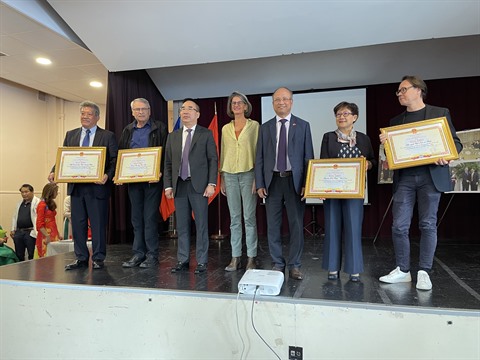 | Le vice-président du VUFO et ambassadeur du Vietnam en France a décerné des médailles à un certain nombre de personnes et d'organisations ayant des contributions typiques aux activités d'amitié et de solidarité avec le Vietnam. |
