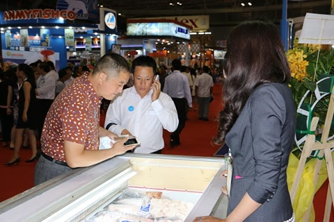 | Des visiteurs dans un stand de l’exposition Vietfish 2015 qui a lieu du 24 au 26 aoȗt à Hô Chi Minh-Ville. |