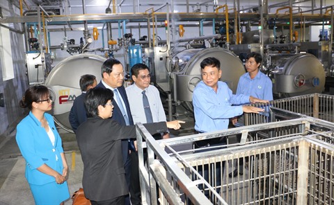 | Le vice-Premier ministre lao Sonexay Siphandone (3e à gauche) visite le 26 octobre la Sarl de transformation de la noix de coco Luong Quoi, à Bên Tre (Sud). |