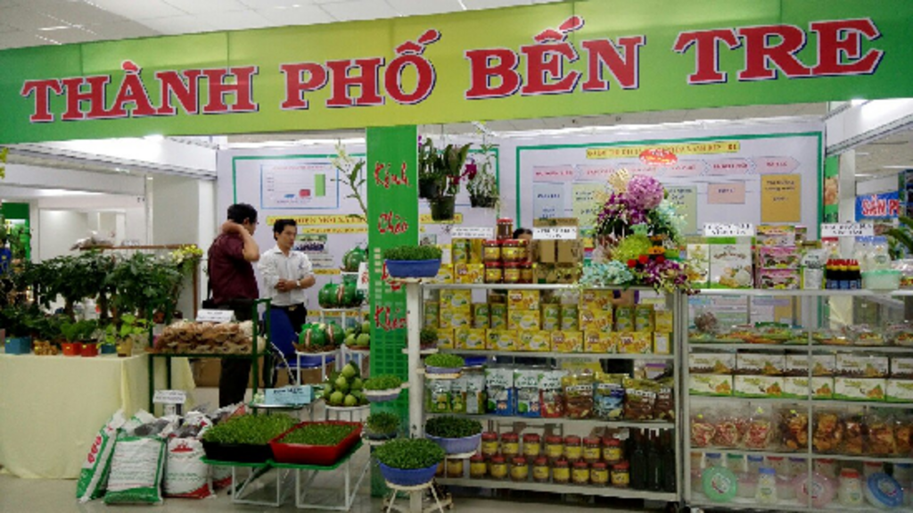 | Les produits OCOP issus de la province de Bên Tre exposés à une foire commerciale locale. |