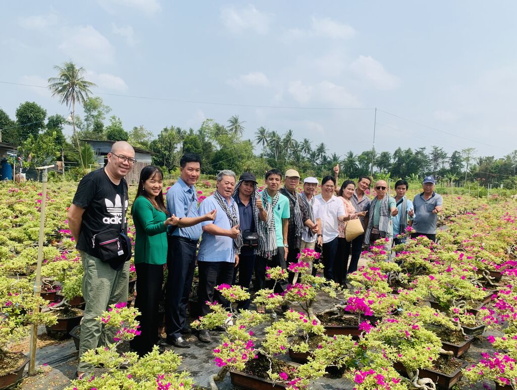 | Des touristes découvrent le Village de fleurs ornementales de Cai Mon dans le district de Cho Lach. |