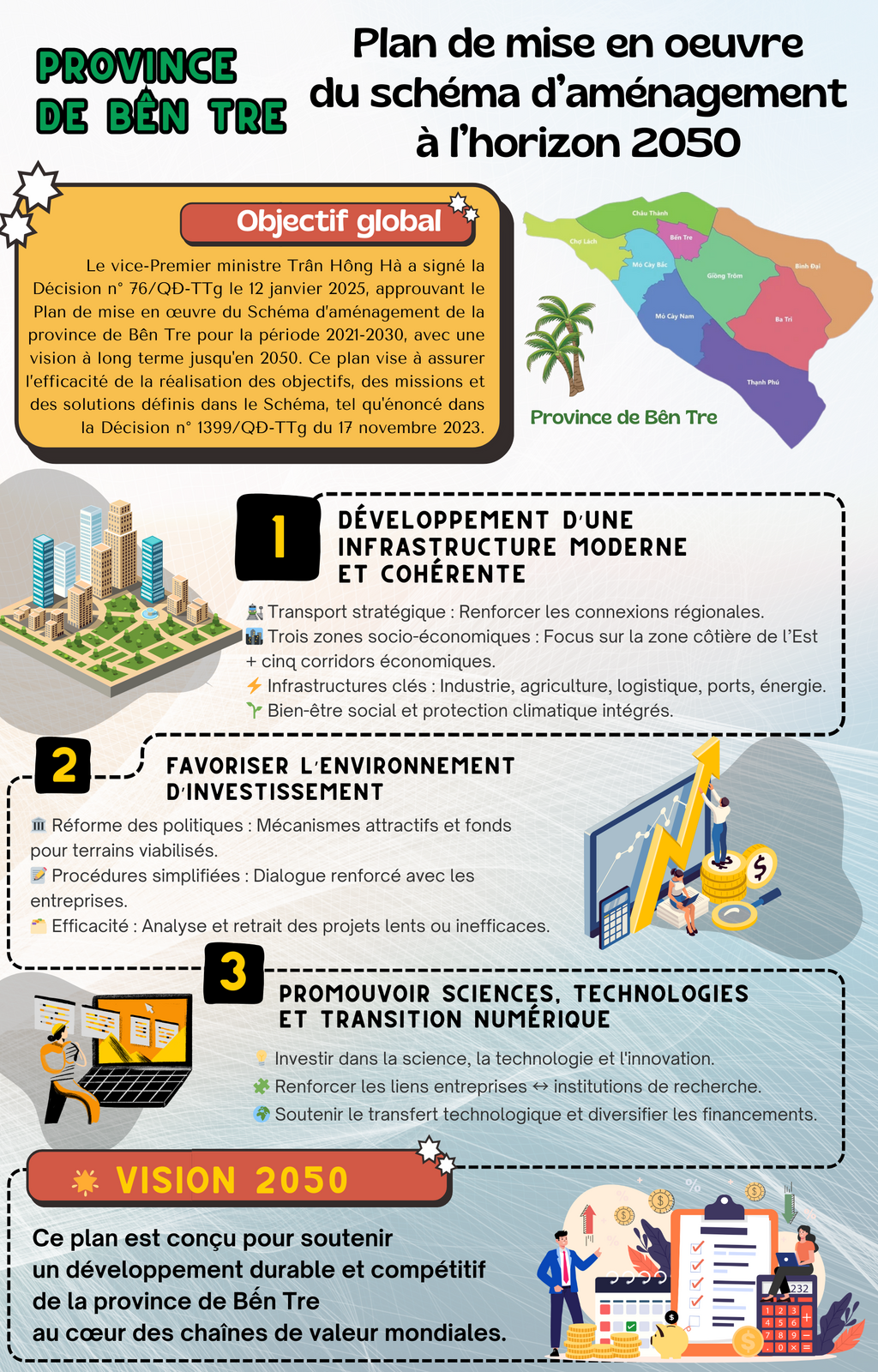 La province de Bên Tre affiche une ambition claire : devenir, d’ici 2030, une région moderne et dynamique, leader économique et social dans le delta du Mékong, avec pour horizon 2050 l’atteinte des standards internationaux dans tous les domaines. Elle entend ainsi renforcer son rôle dans la chaîne de valeur mondiale, en valorisant son identité forte, notamment à travers la marque “Bên Tre – capitale de la noix de coco du Vietnam”.