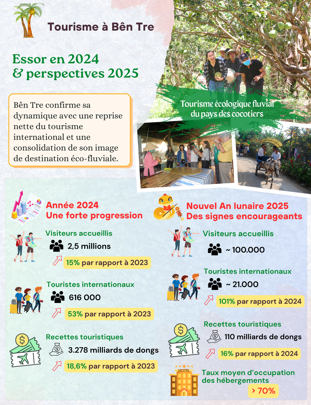 Grâce à ses atouts naturels, tels que ses paysages fluviaux pittoresques, ses vastes cocoteraies et ses valeurs culturelles traditionnelles, le tourisme à Bên Tre attire un nombre croissant de visiteurs, tant nationaux qu'internationaux. Des destinations phares comme l’île Phụng, le complexe écologique Lan Vuong, l’île Nhàn, l’île Bung et les circuits écotouristiques dans les vergers sont devenus des emblèmes de la province.
