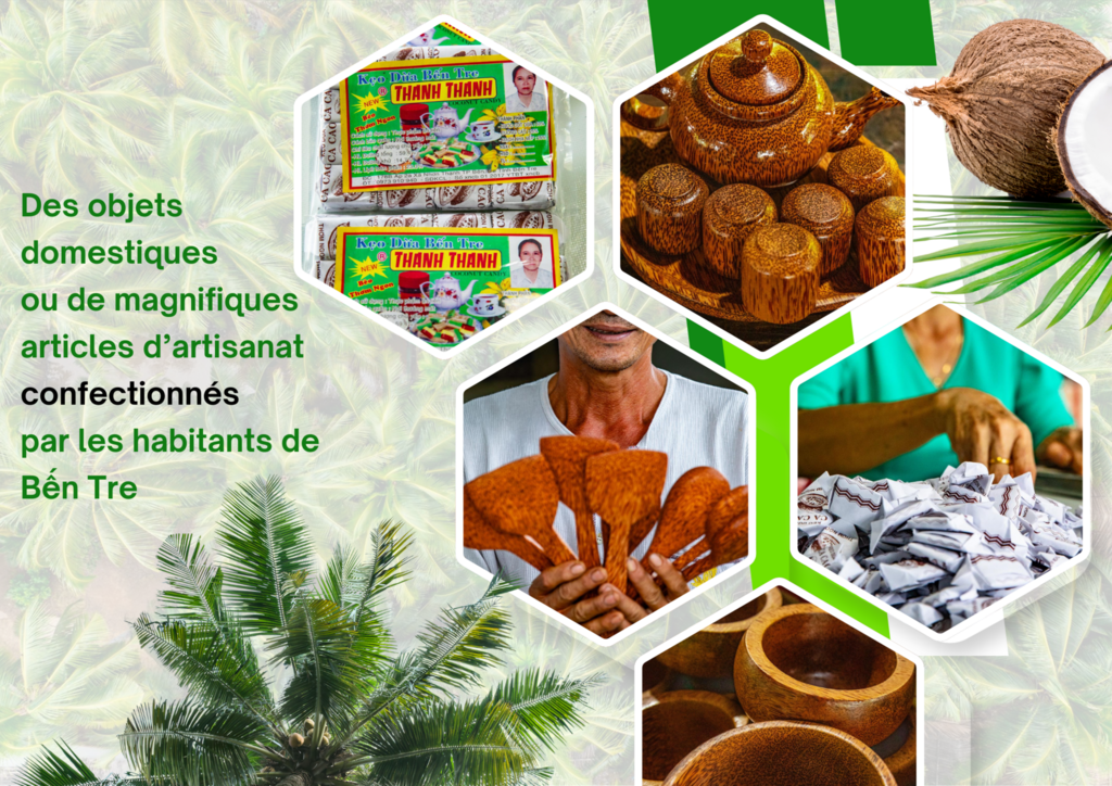 | Outre les produits alimentaires et les boissons à base de noix de coco, les habitants de Bên Tre exploitent également les autres parties du cocotier pour confectionner des objets domestiques ou de magnifiques articles d’artisanat. |