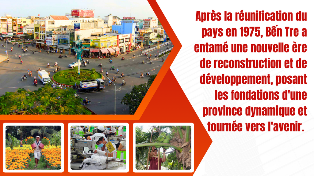 Après la réunification du pays en 1975, Bên Tre entra dans une nouvelle phase de reconstruction et de développement. Sous la direction du Parti et de l’État, la province a progressivement surmonté les conséquences de la guerre, en se concentrant sur le développement économique, culturel et social. À partir de la période de Renouveau (Dôi moi) initiée en 1986, Bên Tre, autrefois province essentiellement agricole, a connu une transformation significative avec l’essor de l’industrie, des services et du tourisme. La province est notamment réputée pour ses vastes cocoteraies, qui constituent une ressource économique majeure. Les infrastructures de transport, telles que le pont Rach Miêu et les routes interprovinciales, ont également été considérablement améliorées, facilitant ainsi le développement économique et touristique.