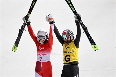 | L'Autrichienne Veronika Aigner et sa sœur Elisabeth Aigner, sa guide lors de son titre paralympique en slalom déficients visuels le 12 mars à Yanqing. |