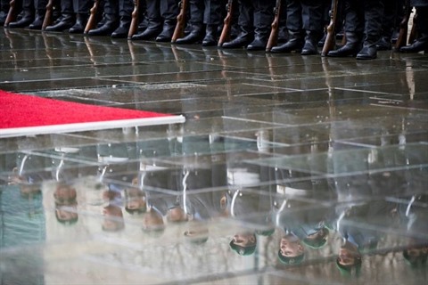 | Des soldats allemands se reflètent dans l’eau de pluie lors d’une garde d’honneur à la Chancellerie à Berlin le 23 février 2017. |