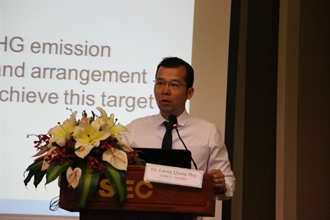 | Le Dr Luong Quang Huy, chef du Bureau de réduction des émissions des gaz à effet de serre, du Département de l’hydrométéorologie et du changement climatique, prend la parole lors de la conférence. |