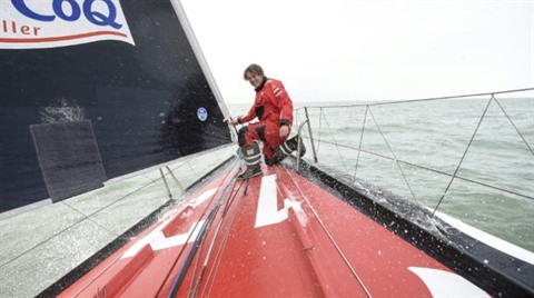| Le skipper français Yannick Bestaven à bord de son Imoca 60 "Maître Coq" le 7 octobre au large des côtes de La Rochelle. |