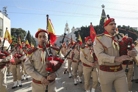 | Des scouts palestiniens défilent sur la place de la Mangeoire le 24 décembre à Bethléem, en Cisjordanie occupée. |