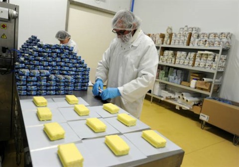 | Un employé d'une coopérative basque emballe du beurre produit à Aldudes, dans le sud de la France, le 30 octobre 2015. |