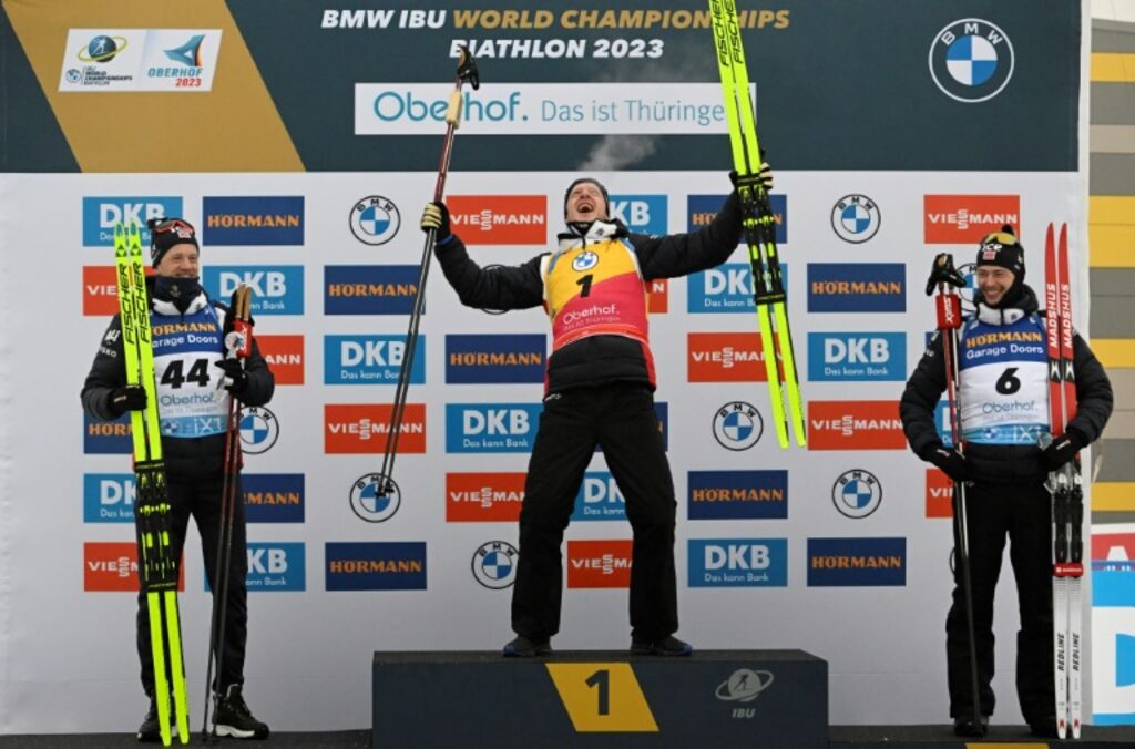 | Triplé norvégien lors du sprint des Mondiaux de biathlon : Johannes Boe (centre) vainqueur devant son frère Tarjei (gauche) et Sturla Laegreid, le 11 février à Oberhof. |