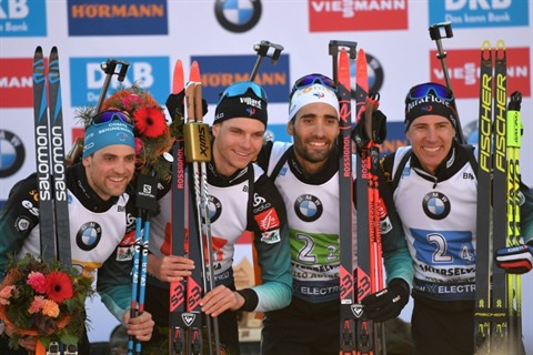 | De gauche à droite : les Français Simon Desthieux, Emilien Jacquelin, Martin Fourcade et Quentin Fillon Maillet, sacrés en relais aux Mondiaux de biathlon, le 22 février à Anterselva. |