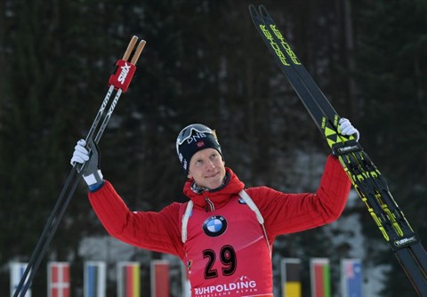 | Le biathlète norvégien Johannes Boe à l'arrivée du 20 km individuel de Ruhpolding, le 10 janvier. |