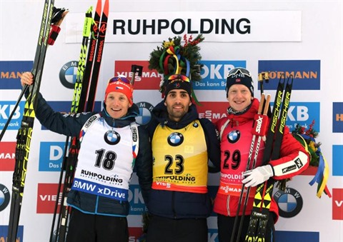 | Le biathlète français Martin Fourcade pose sur le podium après sa vIctoire au 20 km individuel de Ruhpolding, le 10 janvier. |