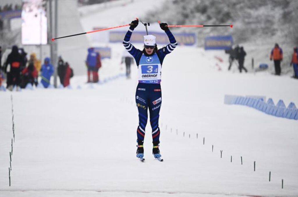 | Julia Simon franchit la ligne lors du relais remporté par la France à Oberhof, Allemagne, le 7 janvier. |