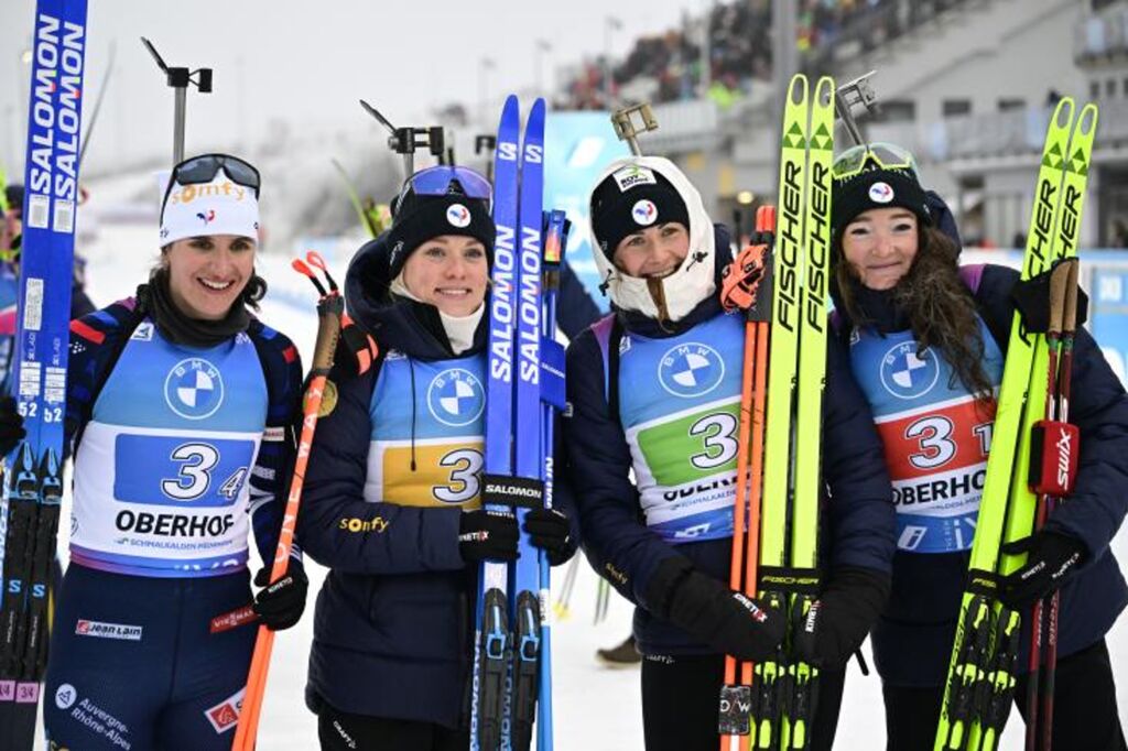 | Les Françaises Julia Simon, Sophie Chauveau, Justine Braisaz et Lou Jeanmonnot-Laurent après leur victoire dans le relais d'Oberhof, Allemagne, le 7 janvier. |