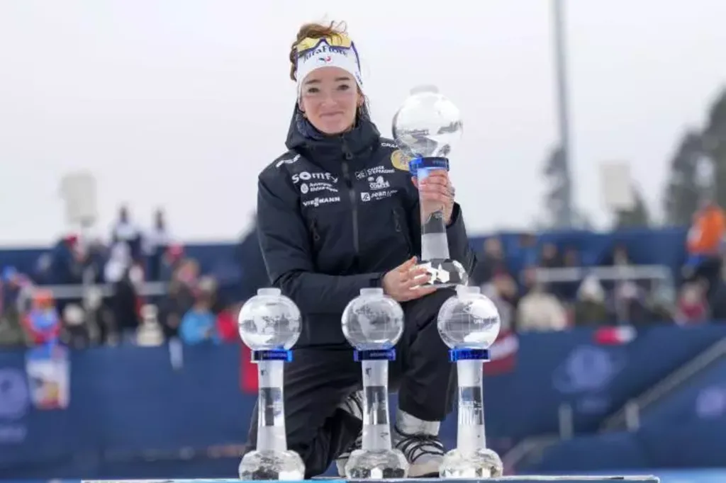 | Lou Jeanmonnot pose avec son gros globe dans les mains, et les trois petits posés devant elle, dimanche 22 mars après la dernière manche de la coupe du monde de biathlon à Holmenkollen en Norvège. |