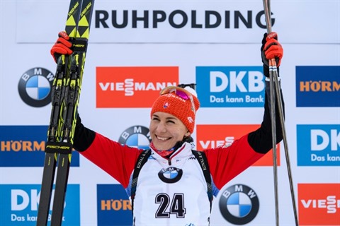 Kuzmina, triple championne olympique, a signé sa 2e victoire de la saison et la 15e de sa carrière en devançant de 11 sec 5/10 l'Italienne Lisa Vittozzi, qui restait sur 2 succès d'affilée, et de 29 sec 01/10 secondes la Suédoise Hannah Oeberg.