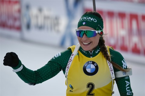 | L'Italienne Dorothea Wierer après sa deuxième place sur la poursuite 10 km à Pokljuka, en Slovénie, le 9 décembre. |