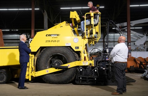 | Le président Joe Biden (gauche) lors de sa visite dans un entrepôt municipal de bus et d'engins de réparation à La Crosse, dans le Wisconsin, le 29 juin. |