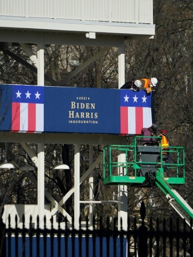 | Installation des banderoles, le 14 janvier à la Maison Blanche en vue de l'investiture de Joe Biden. |