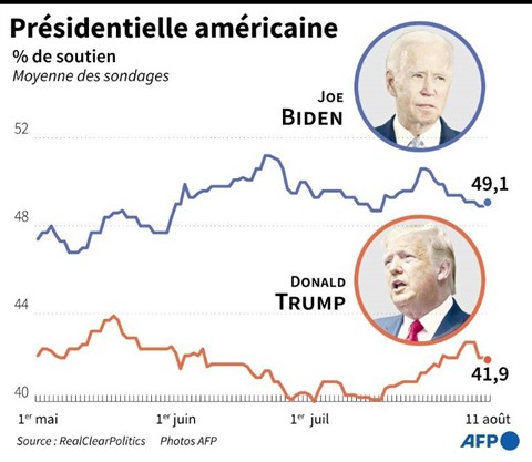 Le nouveau tandem part avec un avantage : Joe Biden devance d'une bonne marge Donald Trump, 74 ans, dans la moyenne des sondages nationaux (entre 6 et 9 points de pourcentage ces 30 derniers jours, selon la moyenne du site RealClearPolitics) mais aussi, plus proche de la marge d'erreur, dans plusieurs États-clés.