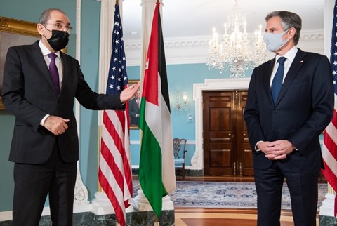 | Le secrétaire d'État américain Antony Blinken (droite) et son homologue jordanien Aymane Safadi |