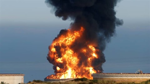 | Une citerne d'un dépôt pétrochimique en feu après avoir été touchée par une roquette du Hamas, à Ashkelon (Israël), le 12 mai. |