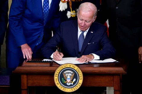 | Le président américain Joe Biden promulgue la réforme "Inflation reduction Act" à la Maison Blanche, le 16 août. |