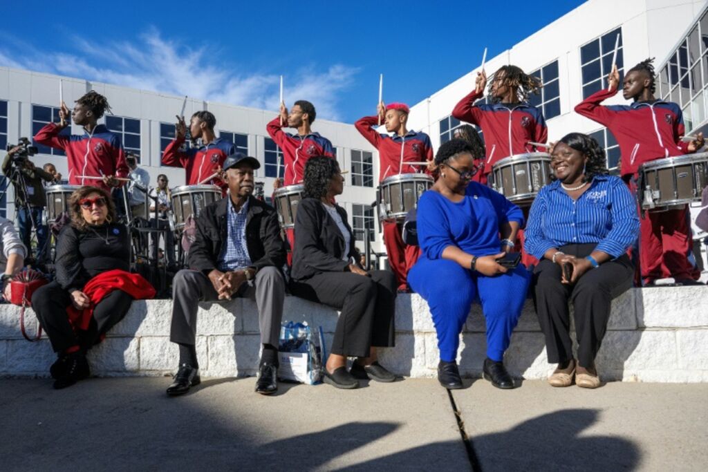 | Des partisans du président américain Joe Biden jouent la fanfare lors de la visite de sa vice-présidente Kamala Harris lors de la campagne pour la primaire démocrate, à Orangeburg, en Caroline du Sud, aux États-Unis, le 2 février. |