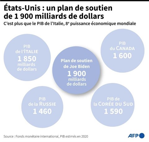 | Infographie comparant le plan de soutien à l'économie américaine présenté par Joe Biden et les PIB d'une sélection de pays. |