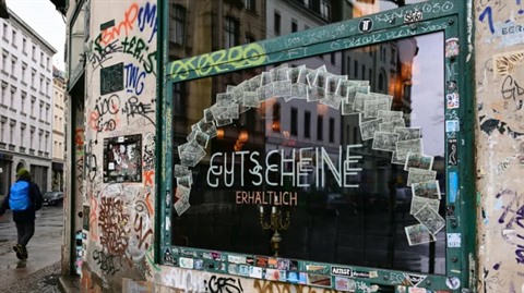 | Virtrine d'un café fermé à Berlin en Allemagne, dans la Oranienstrasse, le 11 mars. |
