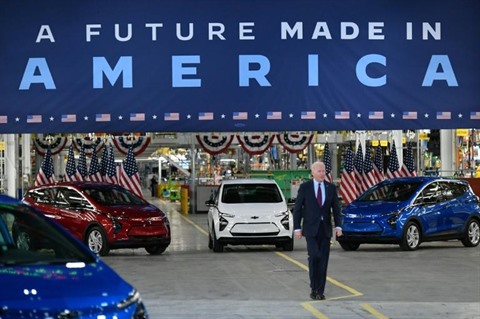 | Joe Biden dans l'usine de voitures électriques GM de Detroit (Michigan) le 17 novembre. |