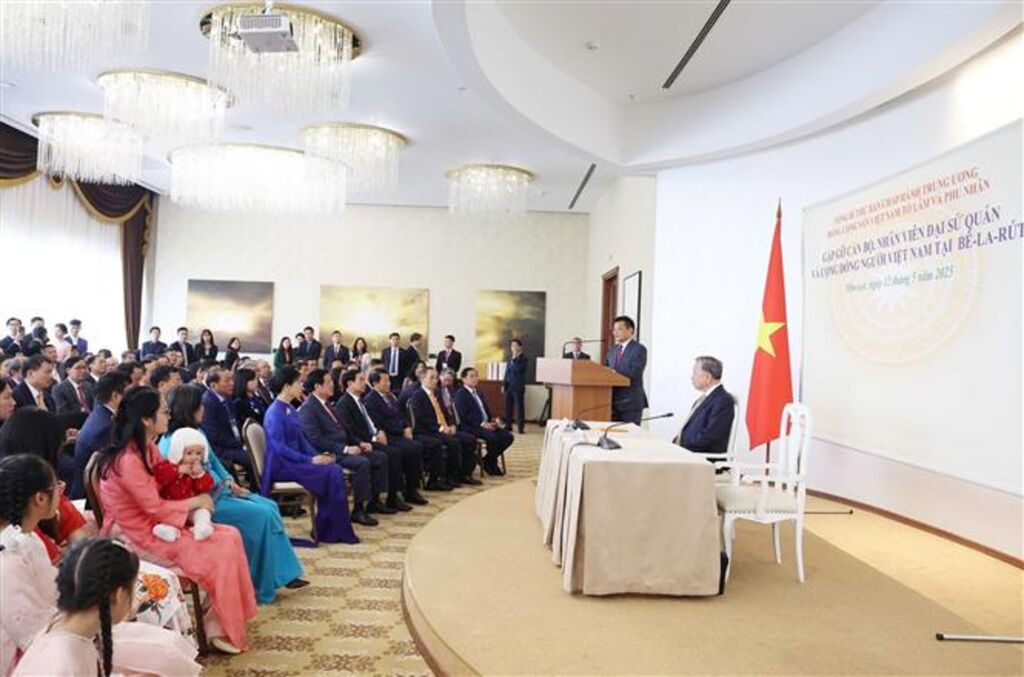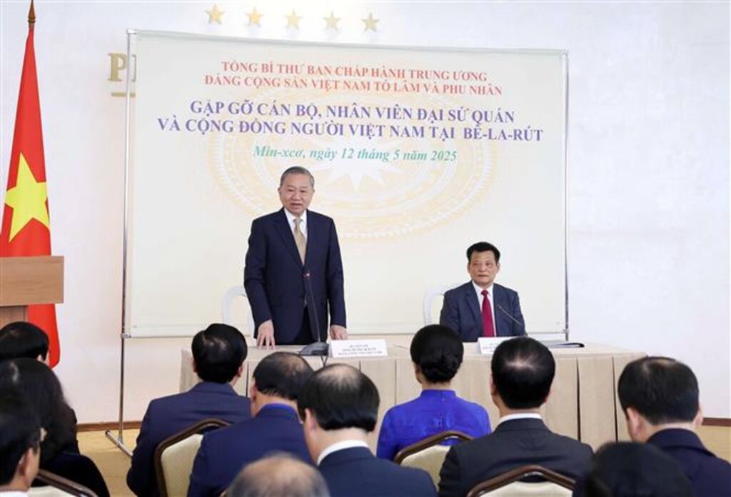 | Le secrétaire général du Parti communiste du Vietnam, Tô Lâm, s'exprime devant le personnel de l’ambassade du Vietnam et des représentants de la communauté vietnamienne en Biélorussie. |