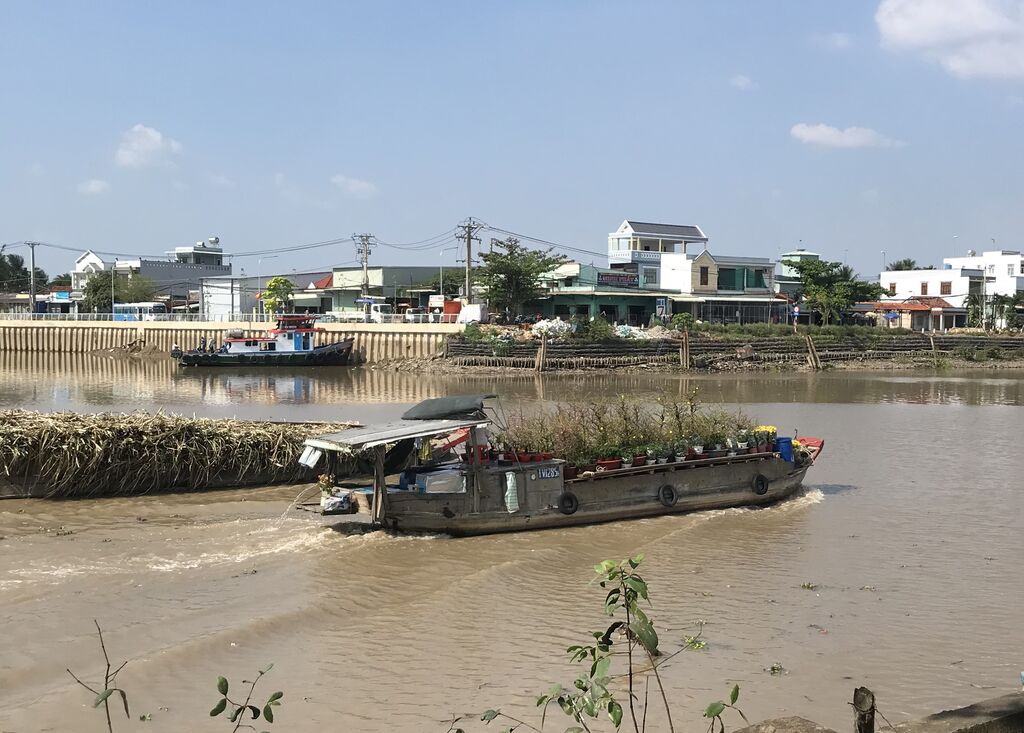 | Un bateau transportant des fleurs d’abricotier de la province de Tiên Giang se dirige vers Hô Chi Minh-Ville pour le Têt du Dragon. |