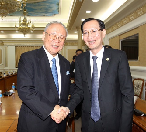 | Le vice-président permanent du Comité populaire de Hô Chi Minh-Ville, Lê Thanh Liêm (droite), et le conseiller spécial de l'Alliance parlementaire d'amitié Japon - Vietnam, Tsutomo Takebe, le 11 janvier dans la mégapole du Sud. |