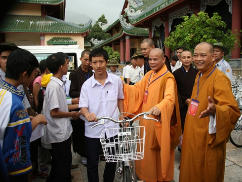 | Les bonzes et les fidèles participent à de nombreuses activités sociales et philanthropiques. Ici, ils offrent des vélos à des élèves démunis ayant d'excellents résultats scolaires. Photo : Van Son VNA/CVN |