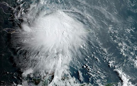 | Image satellite du 23 août de la tempête tropicale Laura se déplaçant au-dessus d’Haïti et de la République dominicaine. |