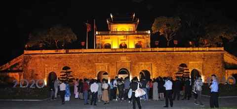 | Des touristes lors d'une visite nocturne de la cité impériale de Thang Long. |