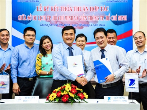 | Cérémonie de signature d’un accord de coopération entre le Service municipal du tourisme et le Groupe des postes et télécommunications du Vietnam (VNPT) pour Hô Chi Minh-Ville. |