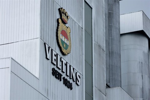 | Le logo de la brasserie Veltins sur une façade de l'usine de Grevenstein, dans l'Ouest de l'Allemagne, le 26 avril. |