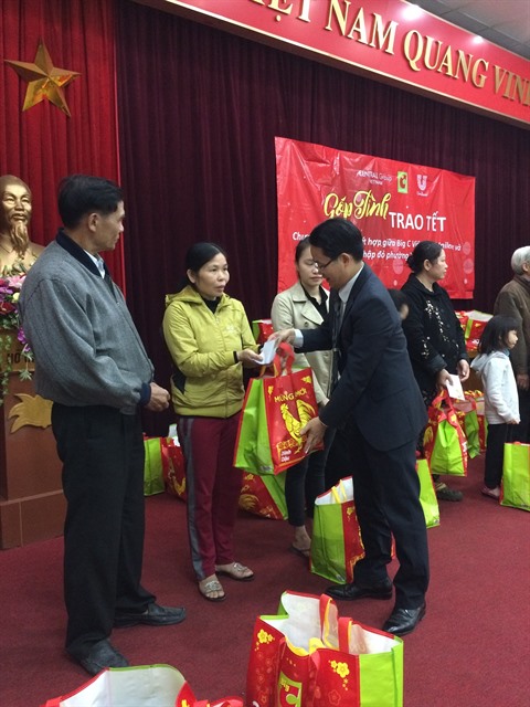 | Un représentant de Big C Thang Long remet des cadeaux à des familles pauvres. |