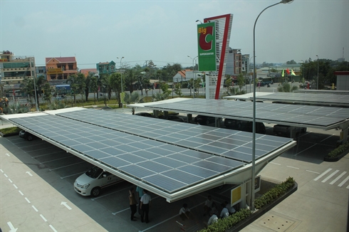 | Des panneaux solaires sont installés sur les auvents du parking du supermarché Big C Di An |