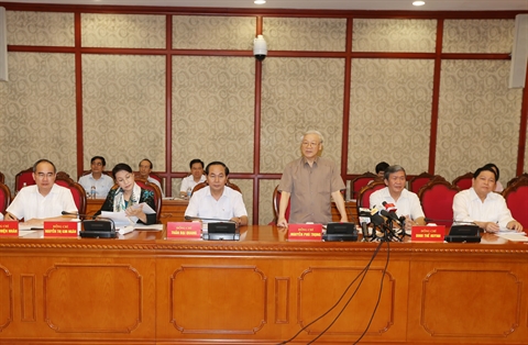 | Le secrétaire général du PCV, Nguyên Phu Trong (debout), préside la réunion sur le bilan de l'application d'une résolution sur la ville de Cân Tho (Sud). |