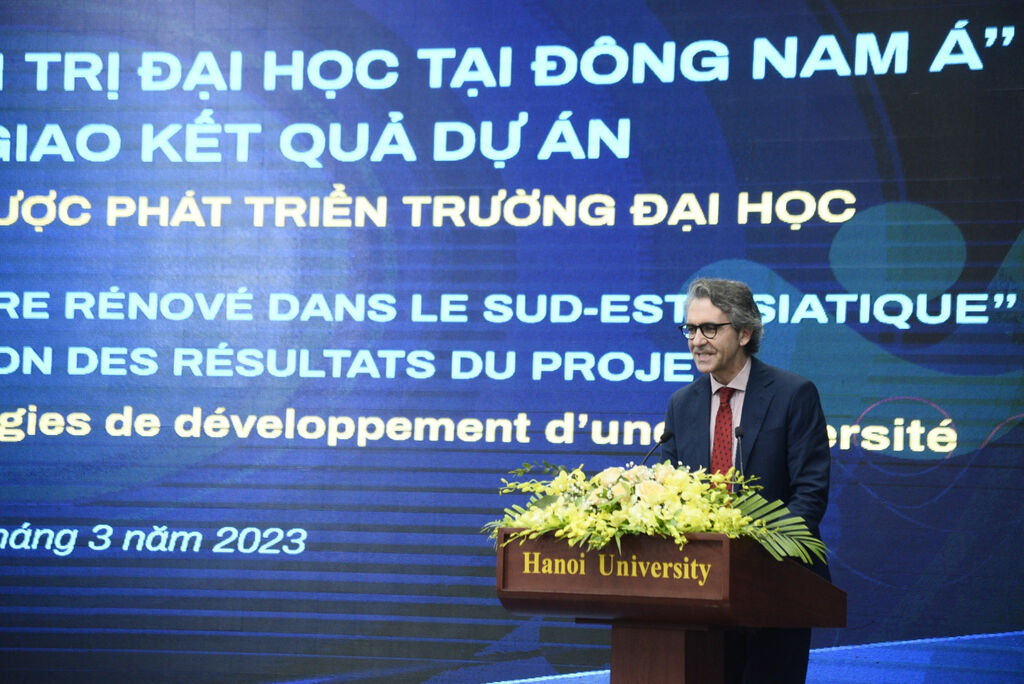 "Grâce aux possibilités offertes par le programme Erasmus, l'UE s'est pleinement engagée à promouvoir et à soutenir la modernisation de l'enseignement supérieur au Vietnam. Nous visons également à renforcer la coopération entre le Vietnam, d'autres pays d'Asie et l'Europe. Le projet +Pilotage universitaire rénové dans le Sud-Est Asiatique+ (PURSEA) est un parfait exemple de cette coopération, dit l'ambassadeur. Ce consortium de 16 membres, dont deux universités cambodgiennes et six universités vietnamiennes, nous permet de partager nos expériences en matière de formulation et de mise en œuvre de stratégies de développement des universités, tout en contribuant à améliorer la qualité de l'éducation et de la formation de ces dernières".