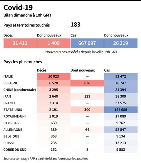 Confrontée à un afflux de malades dans les hôpitaux et à une pénurie de matériel qui s'annonce, la France (plus de 2.600 morts , dont 292 ces dernières 24 heures) a commandé un milliard de masques et compte presque tripler le nombre de lits affectés à la réanimation.